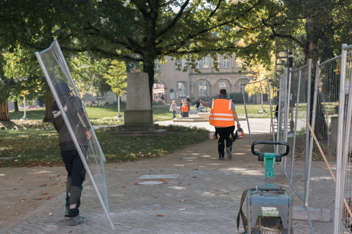 Gearbeitet wird weiter am künftigen Spielgerät nahe dem „Extrablatt“ sowie auf der westlichen Seite des Schloßplatzes in Richtung „Rotes Tor“/Theatervorplatz. Deshalb bleiben diese Teile des Geländes noch eingezäunt. Der Weg am Schloss entlang zum Rosental/Theater kann entsprechend noch nicht wieder genutzt werden, das fürstliche Residenzschloss ist aber erreichbar.