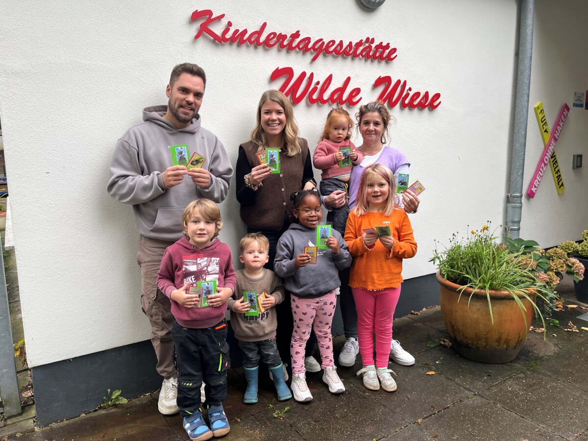 Foto: Gemeinsam mit Kindern des Familienzentrums Wilde Wiese freuen sich die Verantwortlichen auf die Waldrallye: (von links) Jonas Fiebig (Leitung Familienzentrum Wahmbecker Pfad), Laura Bobenhausen (Koordinatorin „kinderstark“ bei der Stadtverwaltung) und Nicole Siefert (kommissarische Leitung Familienzentrum Wilde Wiese). (Foto: Familienzentrum „Wilde Wiese“)