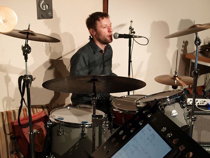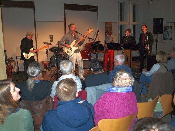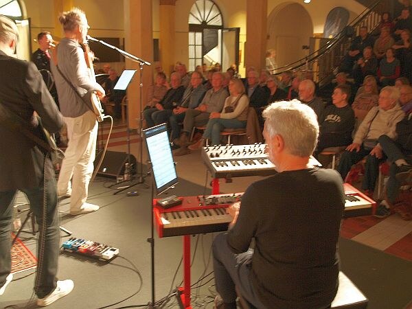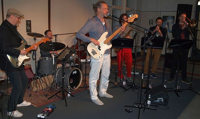 Julian Buhe verpasst seinen Drums eine ordentliche Abreibung – die armen Felle haben am Ende des Abends vermutlich Urlaub beantragt. Wie Fritz Feger, der Bandleader am E- und Kontra-Bass, ist auch Julian eine Lagenser Pflanze und darüber hinaus ein Eigengewächs der Musikschule.