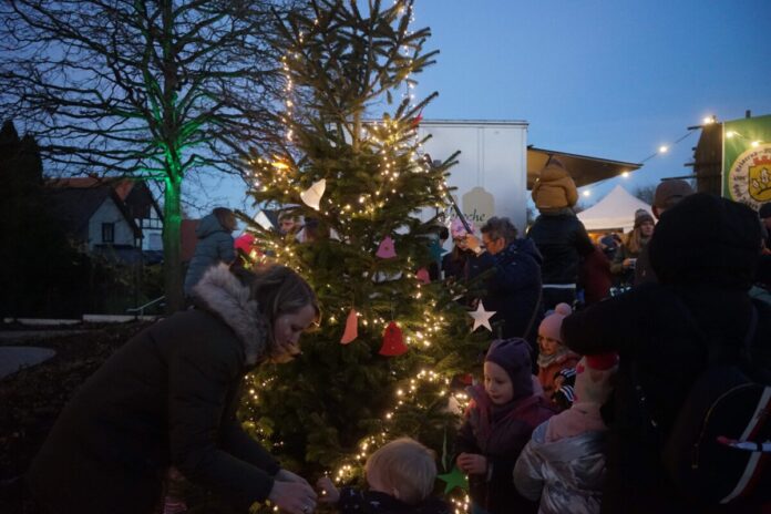 Nach der Begrüßung und Einstimmung auf die bevorstehenden Programmpunkte durch Karl-Heinz Grebisz, dem Vorsitzenden von „Unser Diestelbruch e. V.“, wird es kurze Zeit später im Außenbereich besonders festlich. Um 16.30 schmücken die Grundschüler aus Diestelbruch den Weihnachtsbaum vor dem Treffpunkt und bringen ihn mit von der Grundschule bereitgestellter weihnachtlicher Dekoration zum Strahlen.