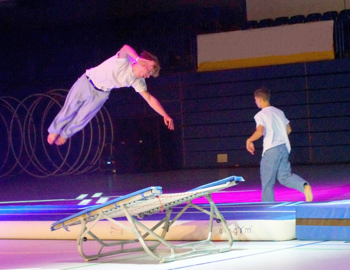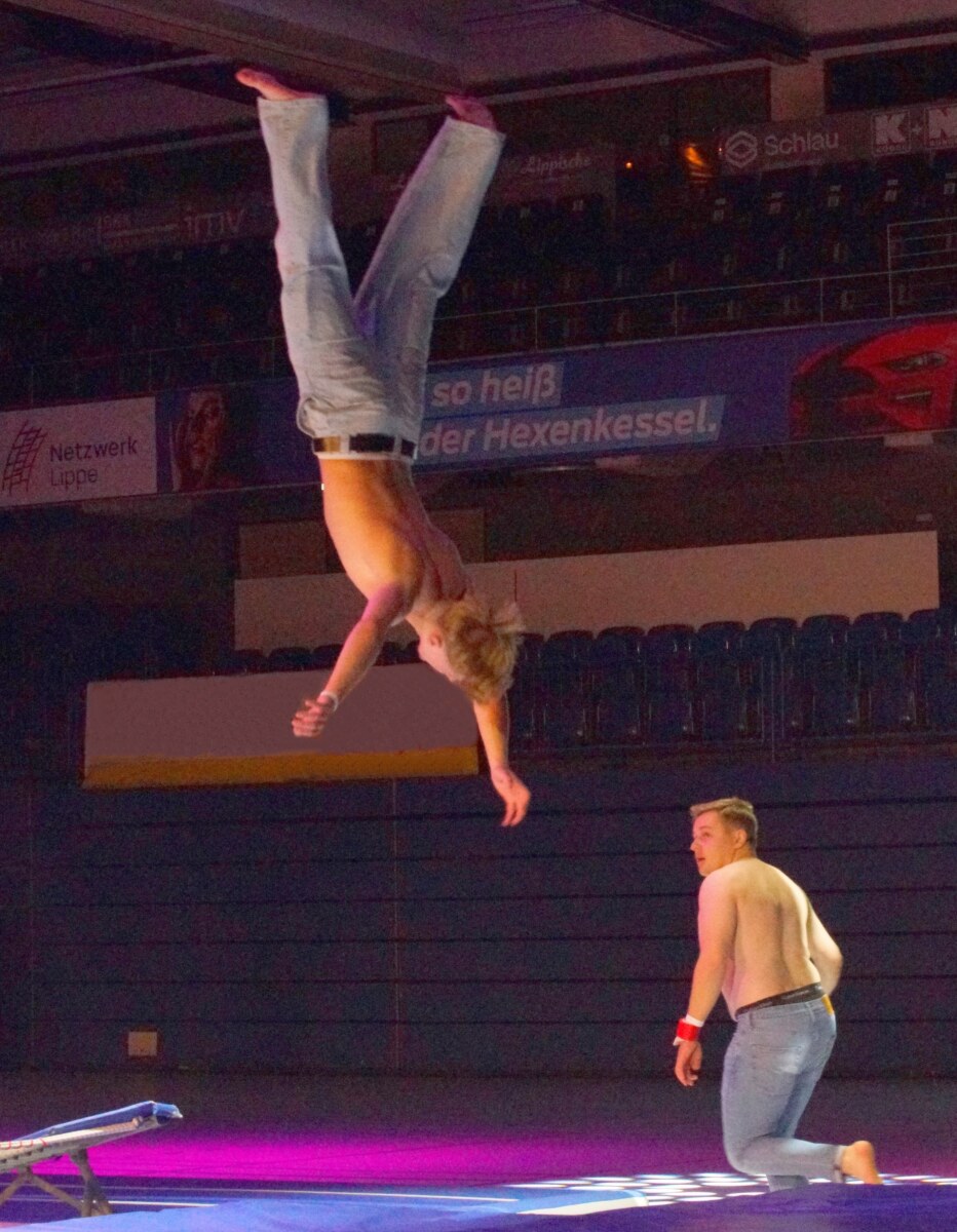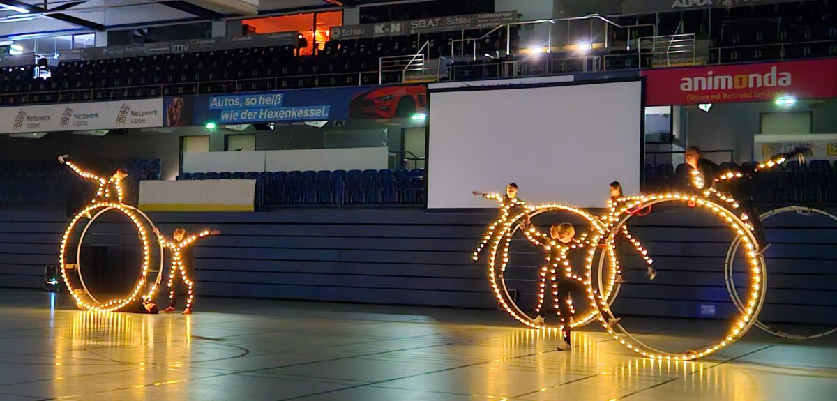 Für einen besonderen Effekt sorgten die sechs Rhönräder des VfL Schlangen, die mit Lichterketten in der dunklen Halle erstrahlten. Moderator Köhler wagte sich selbst ins Rhönrad, bevor das Trampolin-Showteam Airtime Squad mit spektakulären Sprüngen den sportlichen Höhepunkt setzte.