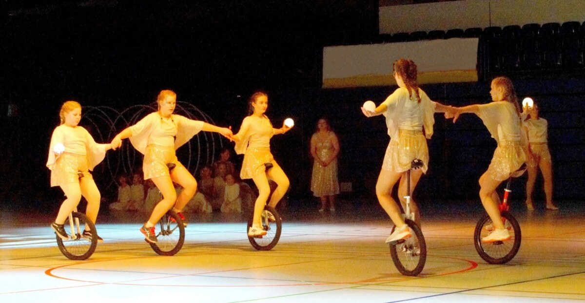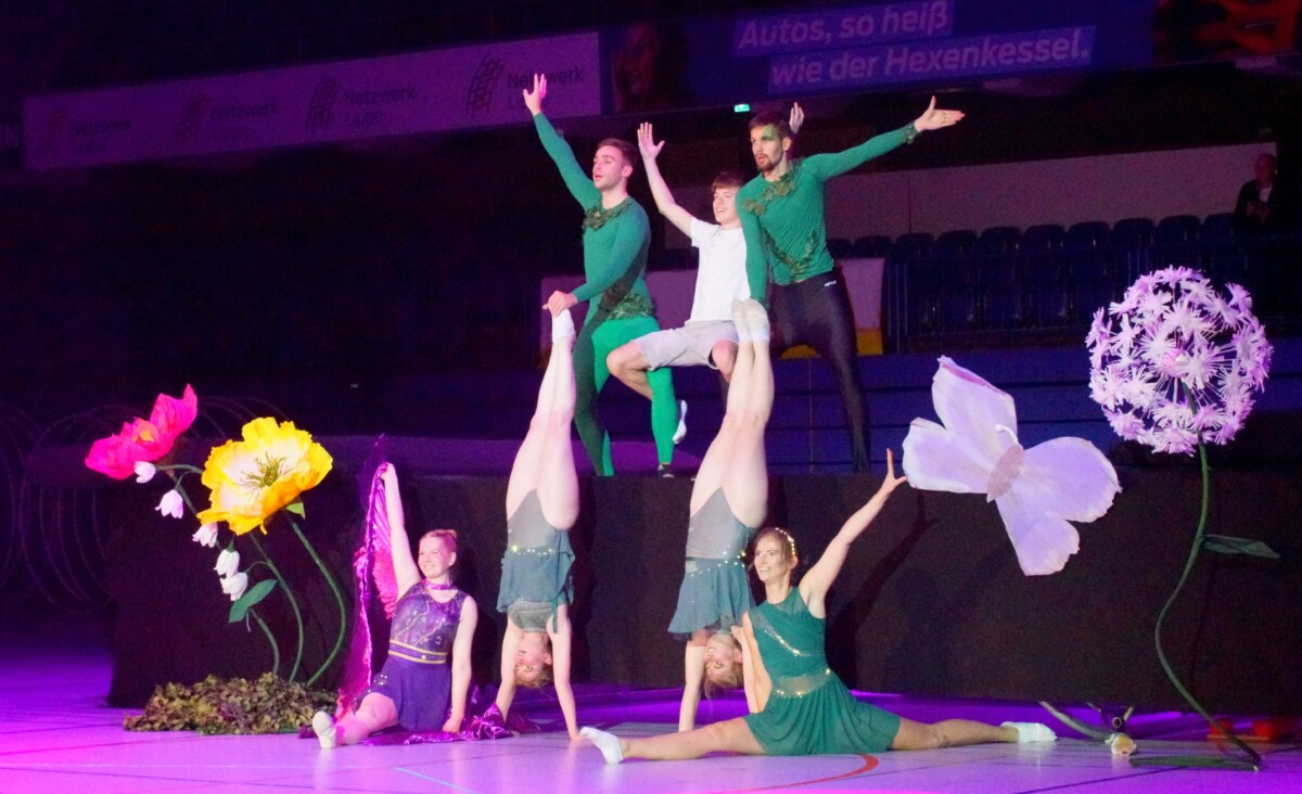 Für Action sorgten die Wushu Lippe Drachenkrieger mit Kampfkunst-Elementen, während die Flying Leo’s vom TuS Leopoldshöhe ihre Akrobatik erst am Boden und dann in der Luft zeigten. Mystisch wurde es bei den SkyLights vom TuS Eichholz-Remmighausen, die mit Einrädern und leuchtenden Kugeln zu „A Sky Full of Stars“ von Coldplay performten.