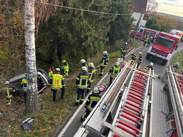 Nach Eingang des Notrufes bei der Leitstelle Lippe wurde auch die Feuerwehr Lemgo alarmiert. Diese machte sich unverzüglich mit insgesamt zehn Fahrzeugen auf den Weg in den Bergkamp. Vor Ort eingetroffen stellte sich die Lage wie gemeldet dar. Der Wagen lag eine Böschung hinab auf der Seite, der Fahrer im Fahrzeug eingeklemmt. So wurde seitens der Feuerwehr der Brandschutz sichergestellt, der Wagen mit Hilfe des Rüstwagens gesichert. Weiter wurde der Wagen unter Absprache mit dem Notarzt auf die Räder gestellt und dann der Fahrer unter Einsatz hydraulischen Rettungsgeräte patientenorientiert aus dem Fahrzeug befreit. Nach gut 30 Minuten war der schwer verletzte Fahrer aus dem Fahrzeug befreit und dem Rettungsdienst übergeben.