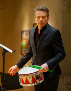 Eindrucksvoller Einmarsch: Mit einer Blechtrommel in der Hand imitiert Roman Kniżka Schusssalven von der Front und setzt damit ein kraftvolles Zeichen für den Beginn der Lesung. Foto: Andreas Leber