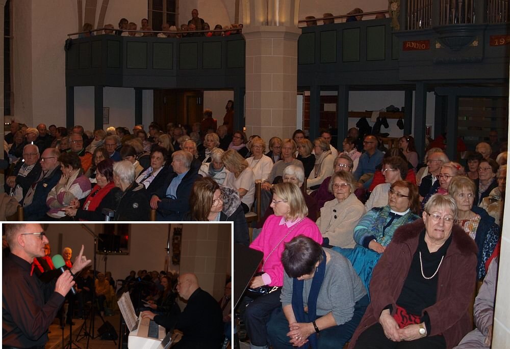 Der Chor startet mit dem Gospel-Song „Here I am, Lord“ von John Michael Talbot (1997). Als „schön und pathetisch“ kennzeichnete Chorvorstand und Konzert-Moderator Achim Lügger den Einstiegssong, der dann auf Anhieb ungewöhnlich viel Applaus einfuhr. Der schwillt zur Pause nach der ersten Halbzeit dermaßen an, dass er sich nach einer Zugabe-Forderung anhörte. Aber die zweite Hälfte sollte ja erst noch kommen.