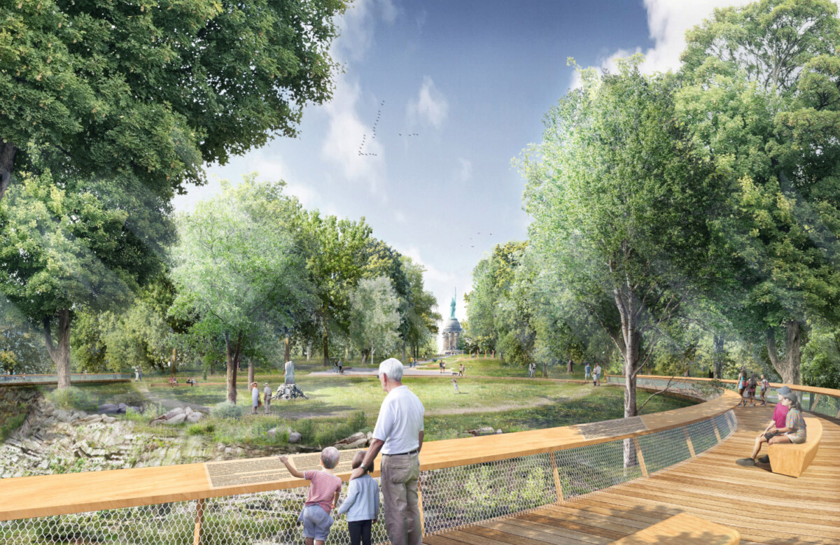 Die Umgebung rund um das Denkmal soll eine neue Grünanlage mit zurückhaltender Bepflanzung erhalten, die ganzjährige Attraktivität und wechselnde Eindrücke garantiere. Vom Hauptweg aus führe ein neu angelegter Weg zu zentralen Verweilplätzen, wo großzügige Rundbänke zum Ausruhen und Entspannen einladen sollen.