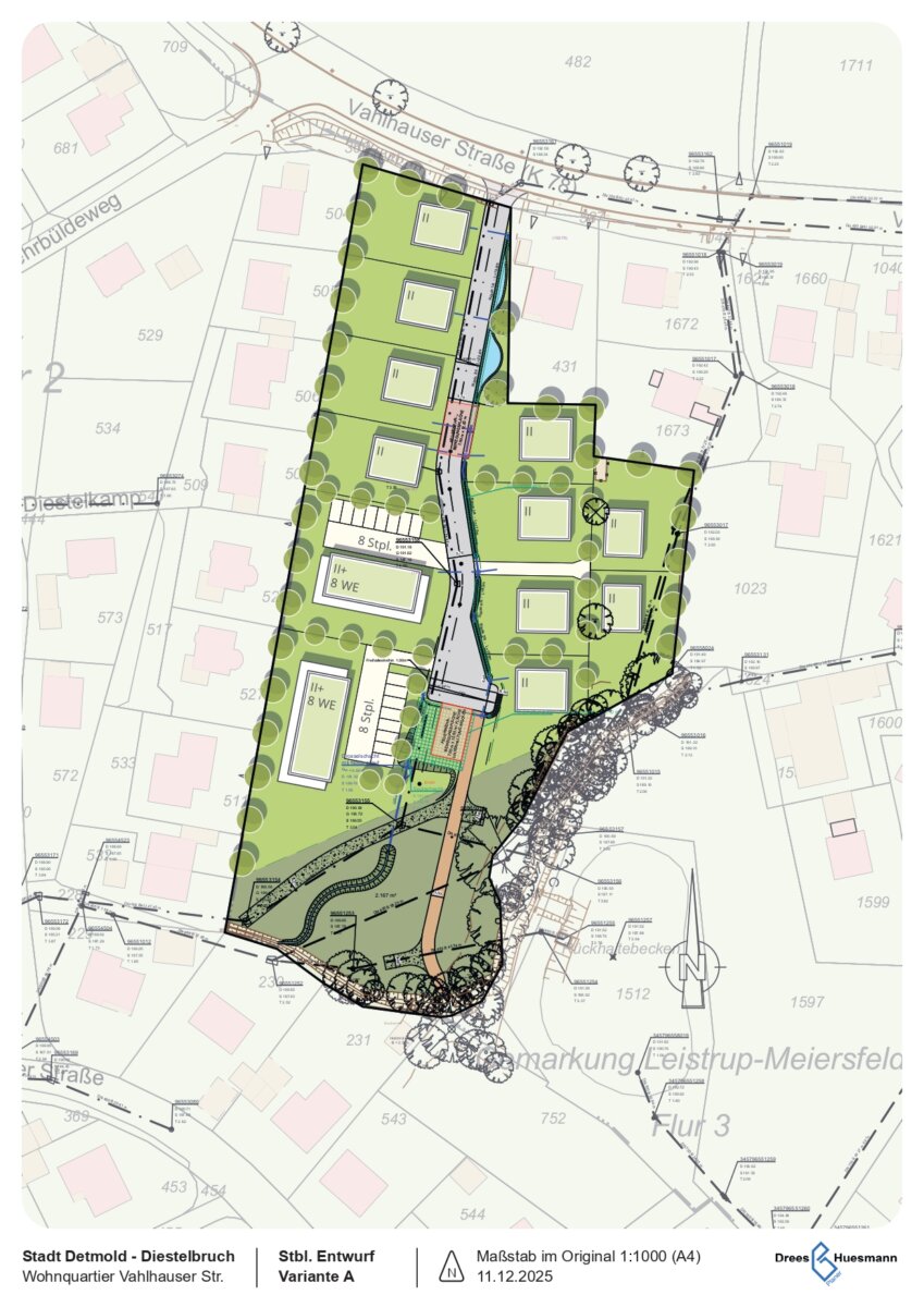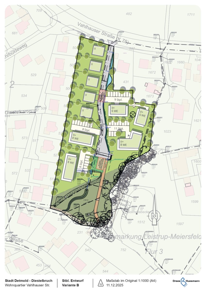 Auf den rund 1,7 Hektar im westlichen Teil von Diestelbruch, welche bis jetzt hauptsächlich landwirtschaftlich genutzt werden, sollen sowohl freistehende Ein- als auch Mehrfamilienhäuser gebaut werden. Bei beiden vorgestellten Varianten ist eine von der Vahlhauser Straße nach Süden in das Plangebiet hineinführende, 5,70 Meter breite Erschließungsstraße vorgesehen, die in einer Wendeanlage endet – für Feuerwehr- und Müllfahrzeuge sei ausreichend Platz berücksichtigt.