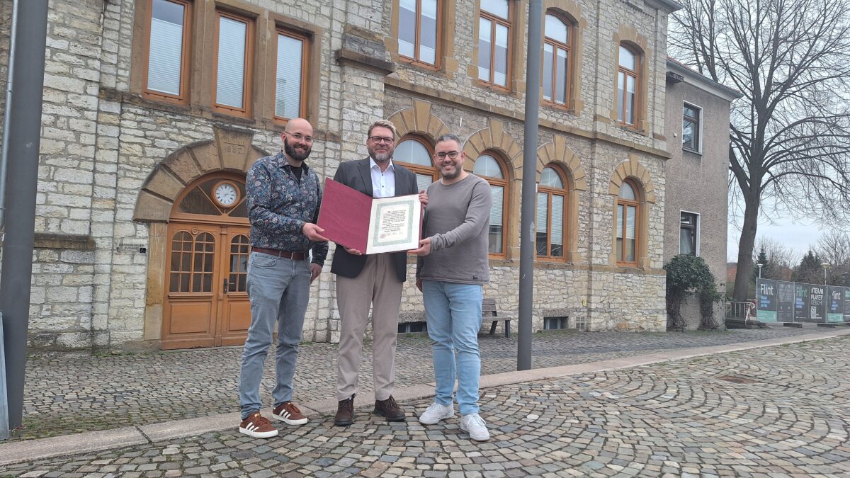 Freuen sich auf das Jubiläumsjahr: (von links) Michael Benneker (Stadtwerke Oerlinghausen), Bürgermeister Peter Heepmann mit der Urkunde der Stadtreche und Patrick Piecha (Oerlinghausen Marketing). Foto: Oerlinghausen Marketing e.V./Tanja Feg