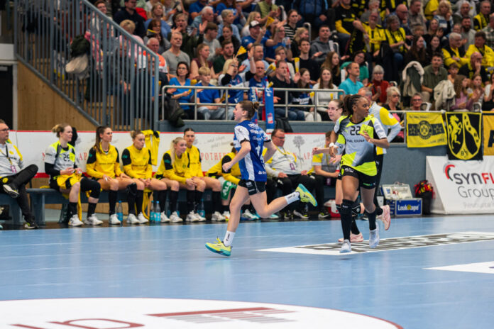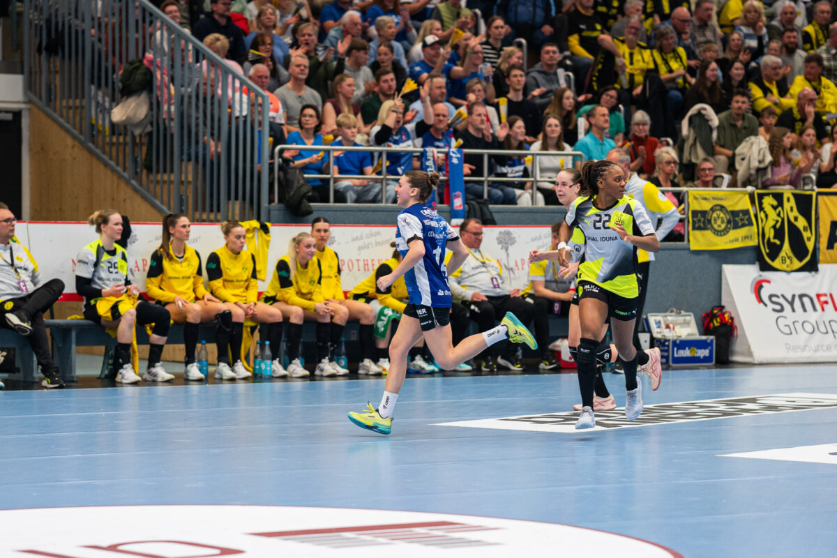 Auf Dortmunder Seite fehlte Sarah Wachter, sodass Melinda Szikora zwischen den Pfosten begann. Zudem setzte Trainer Henk Groener auf Alina Grijseels, die auch gleich den ersten Treffer der Partie erzielte. Die HSG ließ sich davon jedoch nicht beeindrucken: Díana Magnúsdóttir tankte sich früh durch und holte den ersten Siebenmeter heraus, den Ona Vegué sicher verwandelte.