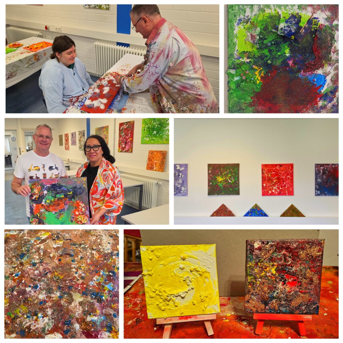 Gearbeitet wurde mit Fingern, Schwämmen und freien Techniken, begleitet von Mitarbeiterin Tumukisa Grundhöfer. Die Ergebnisse überraschten durch ihre Vielfalt und Ausdruckskraft. Begeistert zeigte sich auch Christian Schröter von der Karla-Wagner-Stiftung aus Gütersloh, die das Projekt spontan mit Leinwänden und Farben unterstützte. So kann nun eine weitere Gruppe von acht Teilnehmenden von dem Angebot profitieren. Zusätzlich stellt Künstler Antonio Ugia eigens geschaffene kleinere Werke zur Verfügung, deren Erlös vollständig in die Fortführung des Projekts und direkt in die Einrichtung fließt.